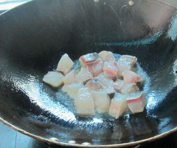 5. 放入腌制好的肉片和鱼片,快速翻炒至变色。