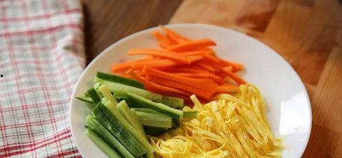 2. 处理蔬菜:将黄瓜、胡萝卜、豆芽、木耳、香菇切成细丝,备用。